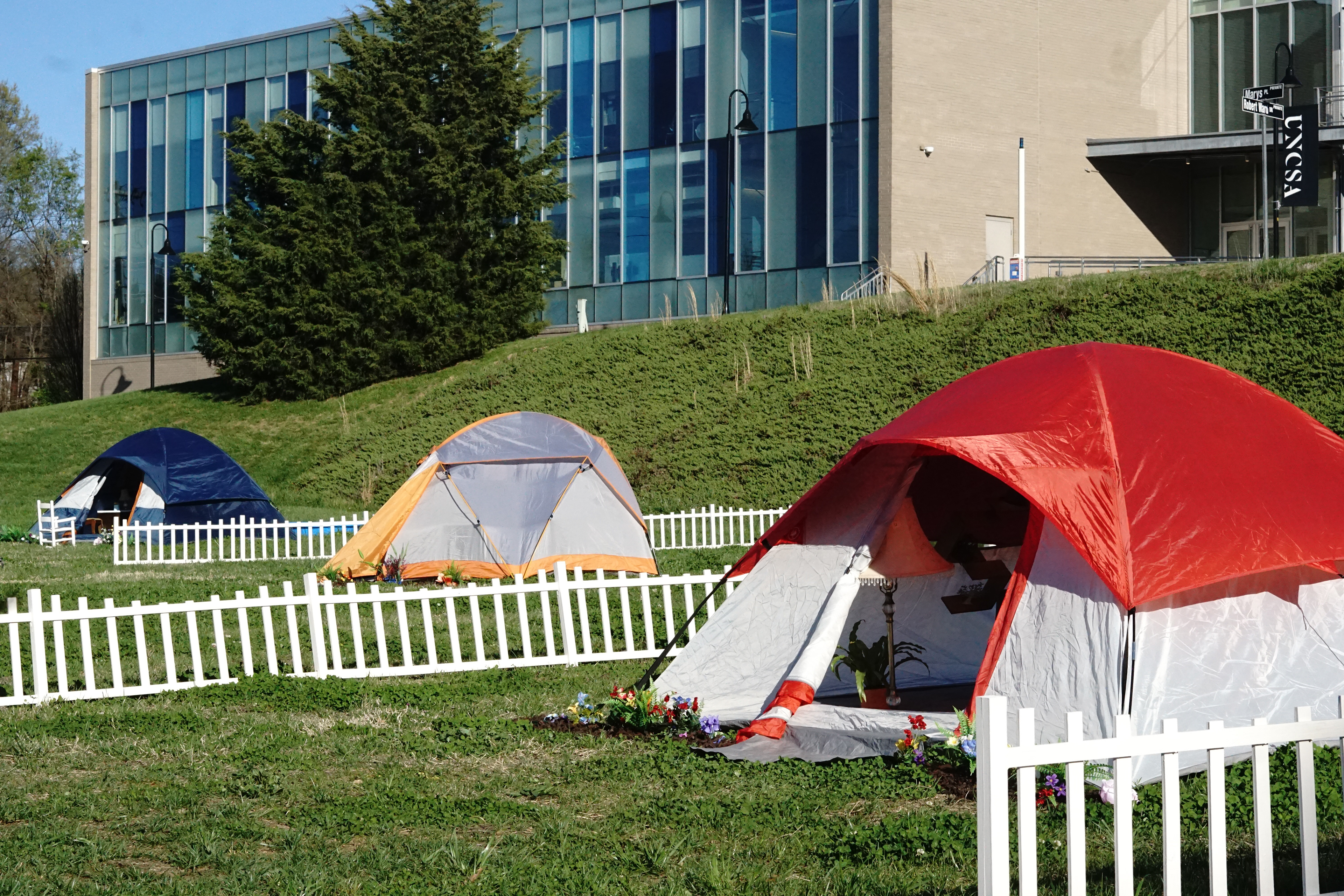 A School of Design & Production produced installation in the “Freedom of Expression Area” at University of North Carolina School of the Arts, April 2nd-16th, 2023. Tent City will inspire introspection, empathy, and activism by allowing systemic failures affecting an under-voiced community to unfold in front of our audience’s eyes. Inspired by our own connections to the affordable housing crisis, we hope our audience challenges their own personal biases about what home is and take action.